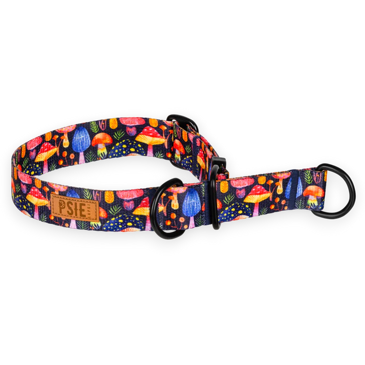 Ta czarna obroża półzaciskowa w kolorowe grzybki to propozycja dla opiekunów, którzy lubią odważne wzory i chcą wyróżnić psa na spacerze. Psychodeliczny print przyciąga uwagę, a konstrukcja martingale (półzaciskowa) daje praktyczne wsparcie na co dzień – bez klamry, bez zbędnych elementów i z wygodą zakładania przez głowę.