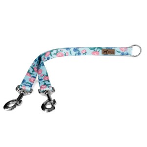 Smycz podwójna dla dwóch psów - łącznik - błękitna w kwiaty