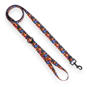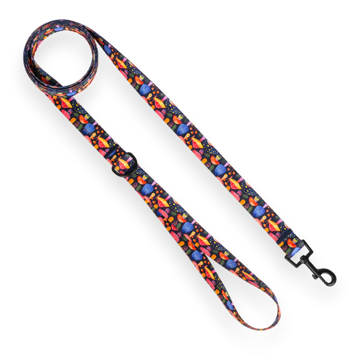 Smycz dla psa 1,6–10 m Czarna w kolorowe grzyby – jedna smycz na miasto i teren