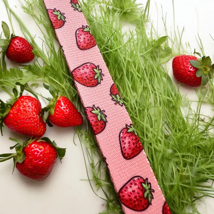 Smycz została wykonana z mocnej, wzorzystej taśmy poliestrowej w różowym kolorze z motywem truskawek, odpornej na zabrudzenia. Materiał jest łatwy w czyszczeniu, szybko schnie i zachowuje kolory nawet przy częstym użytkowaniu.