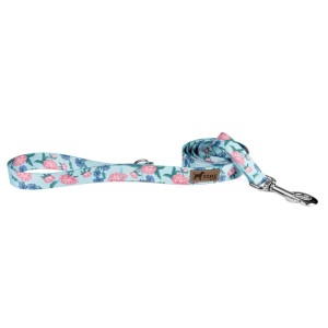 Modny wzór kwiatowy na błękitnym tle, trwała taśma nylonowa i solidny karabinek – ta smycz łączy estetykę z praktycznością. Pasuje do psów, które dopiero uczą się chodzenia na smyczy, jak i do tych, które mają spacery już w małym palcu.