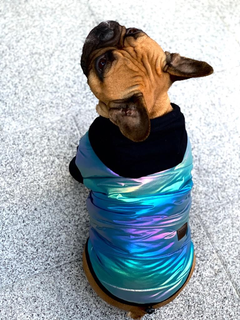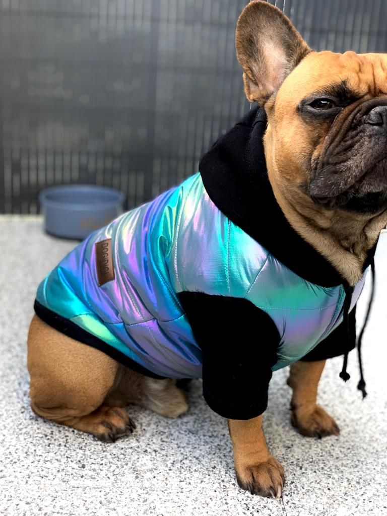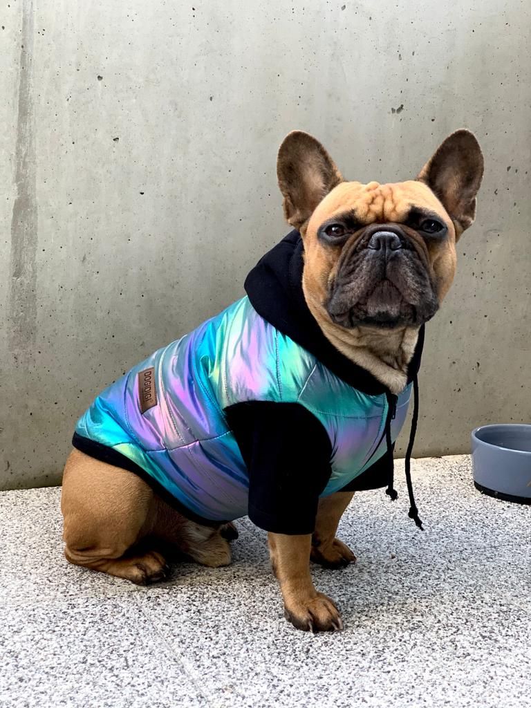 Ciepła tęczowa mieniąca się kurtka zimowa dla psa - ubranie zimowe dla buldoga francuskiego i nie tylko