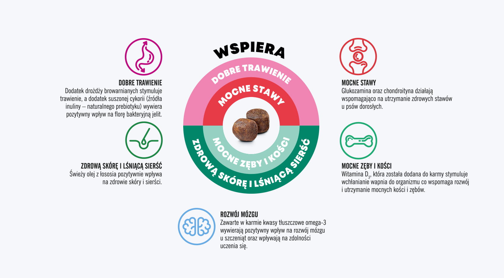 Hydrolizowane białko zwierzęce z wieprzowiny (4%) charakteryzuje się zwiększoną przyswajalnością składników odżywczych, co wspiera intensywne procesy wzrostu. Tłuszcz zwierzęcy wołowy (10,5%) zapewnia dodatkową energię i niezbędne kwasy tłuszczowe, potrzebne intensywnie rozwijającym się szczeniętom.