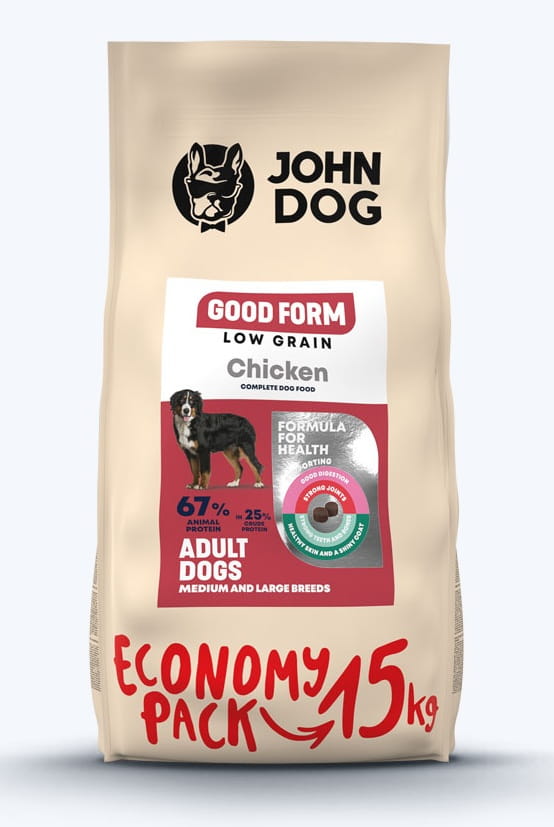 Marka John Dog tworzy karmy opracowane z myślą o zdrowiu i dobrostanie psów. Linia Good Form to receptury z dodatkami funkcjonalnymi, przygotowane przez specjalistów żywienia zwierząt dla psów różnych rozmiarów i w różnym wieku.