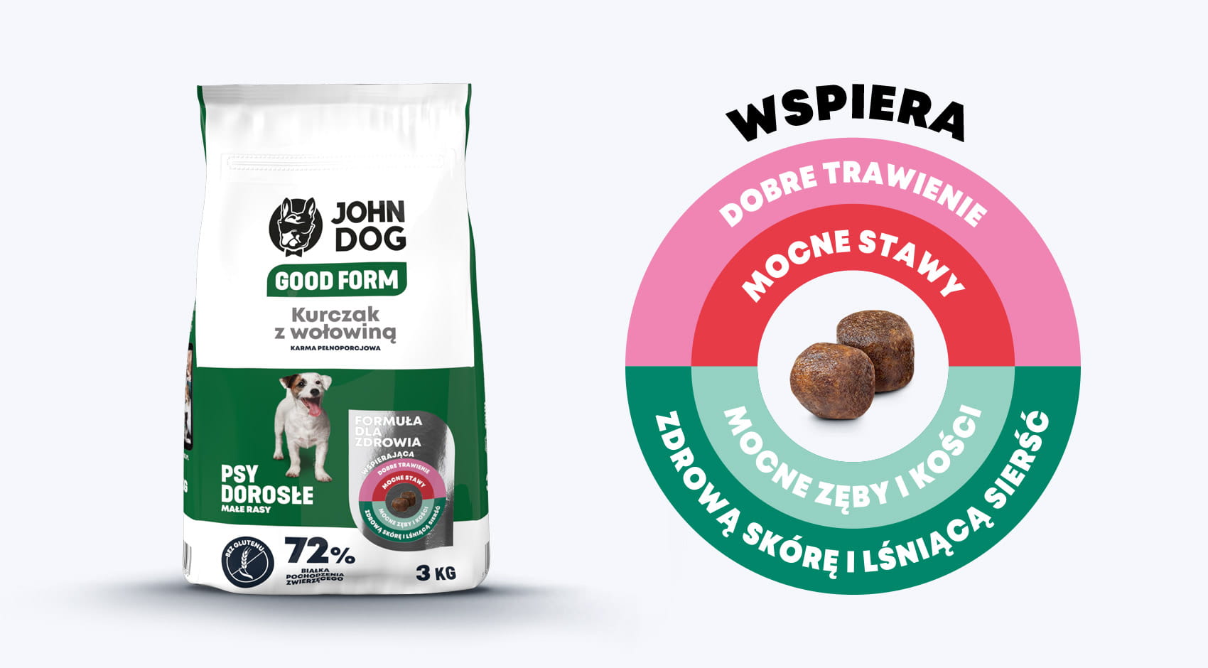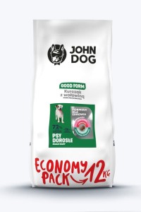 Marka John Dog tworzy karmy opracowane z myślą o zdrowiu i dobrostanie psa na różnych etapach życia. Linia Good Form to receptury przygotowane przez specjalistów żywienia zwierząt, dopasowane do potrzeb psów różnych rozmiarów i w różnym wieku.