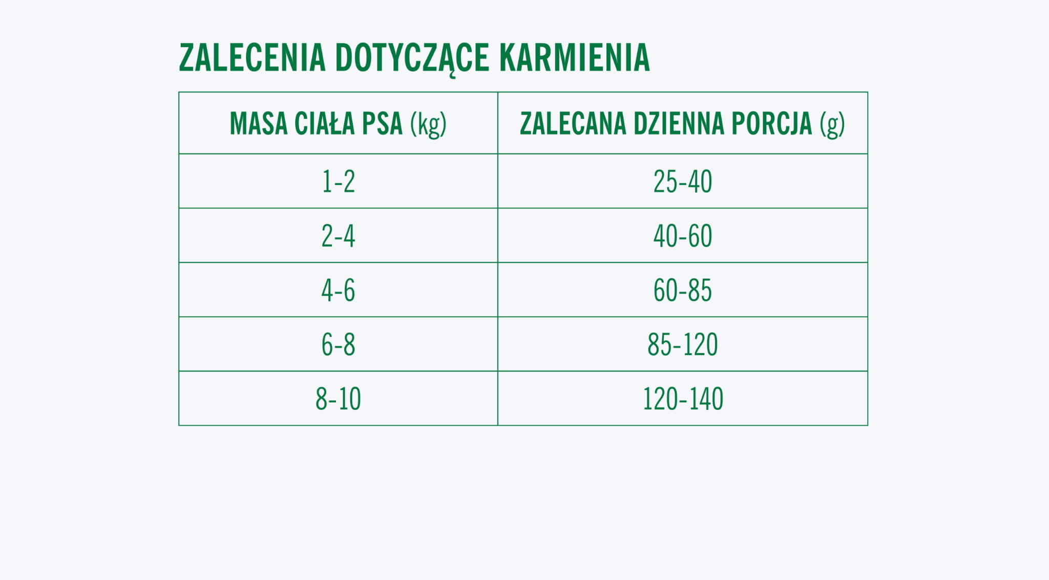 Dzienną porcję dopasuj do masy ciała, wieku, aktywności i indywidualnych potrzeb psa. Ze względu na szybszy metabolizm małych ras, porcję warto podzielić na 2–3 posiłki dziennie. Nową karmę wprowadzaj stopniowo przez 7–10 dni, mieszając z dotychczasową, i zapewnij stały dostęp do świeżej wody.