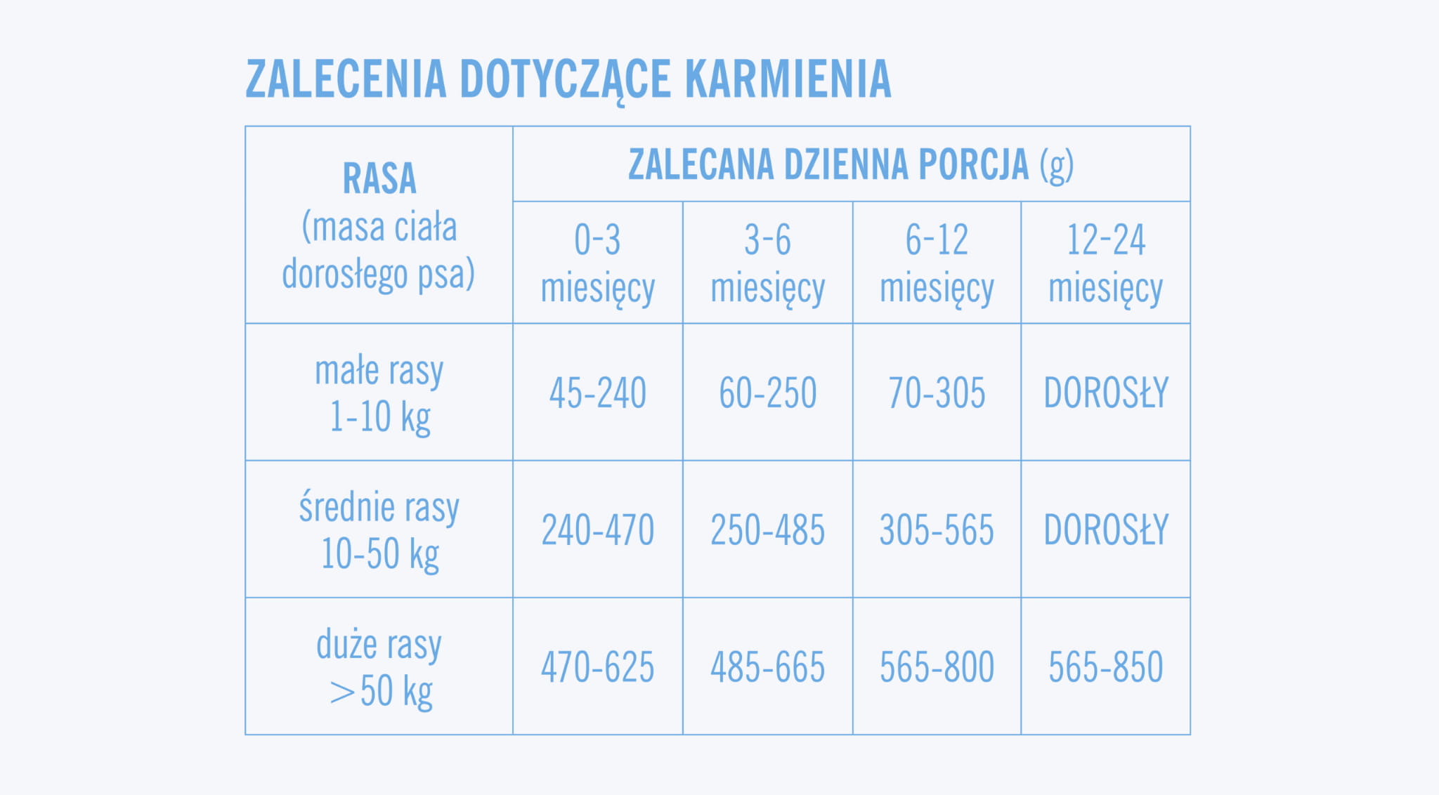 Dawkowanie dopasuj do wieku, masy ciała, rasy i indywidualnych potrzeb rozwojowych szczenięcia. Do ok. 4. miesiąca życia zwykle zaleca się 3–4 posiłki dziennie, a starszym szczeniętom 2–3 posiłki dziennie, zawsze w regularnych porach. Przy przejściu z mleka matki na karmę suchą granulki można na początku namaczać w ciepłej wodzie; zmianę karmy przeprowadzaj stopniowo przez 7–10 dni i zapewnij stały dostęp do świeżej wody.