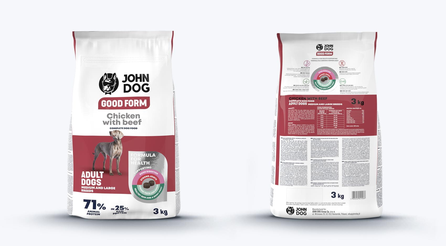 Linia John Dog Good Form obejmuje karmy suche opracowane z myślą o zdrowiu i dobrostanie psów. Receptury przygotowano we współpracy ze specjalistami żywienia zwierząt, aby zapewnić kompletne żywienie dla psów różnych rozmiarów i w różnym wieku.