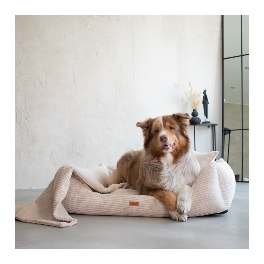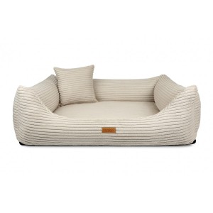 Wygodne legowisko dla psa w tonacji beżowej z wyciąganym materacem wnosi do domu ciepło i przytulność. Beż dobrze łączy się z drewnem, bielą, brązami i naturalnymi dodatkami, a prążkowana faktura wygląda elegancko i „meblowo”.