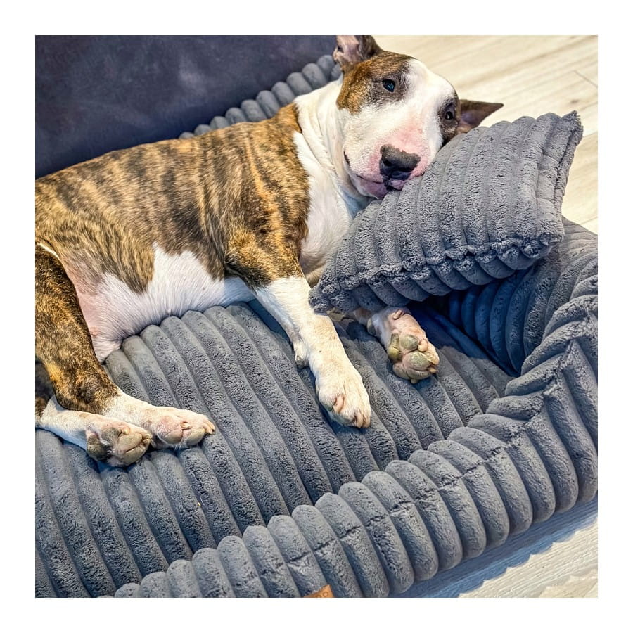 Pokrowiec legowiska jest w 100% rozbieralny; zalecane jest pranie w 30°C. To praktyczne rozwiązanie, gdy pies wnosi piasek po spacerze lub gdy chcesz regularnie odświeżać posłanie.