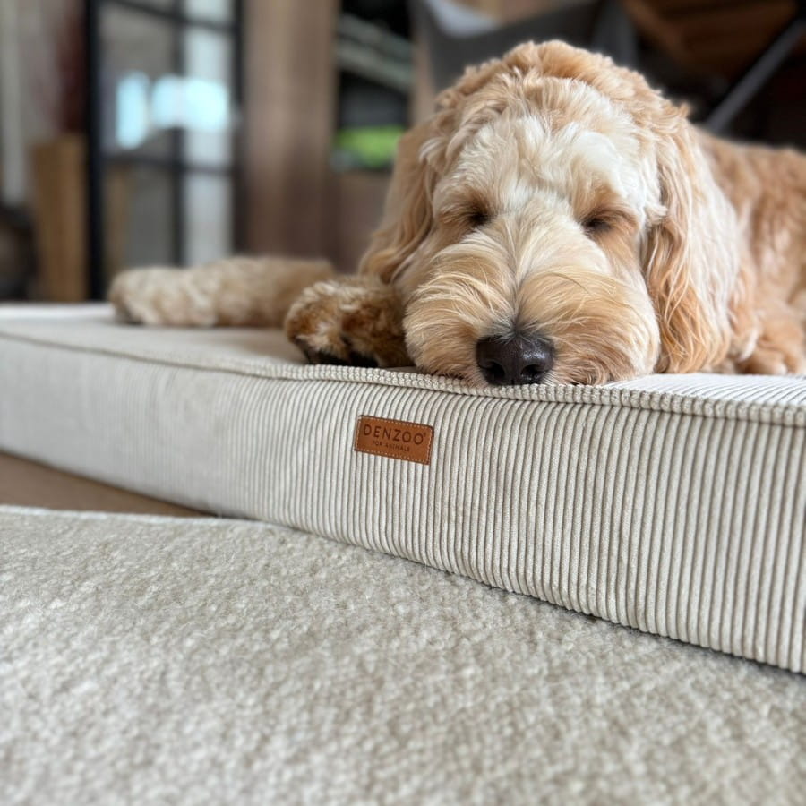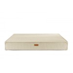 Funkcjonalność nie musi wykluczać stylu. Patrząc na materac Torino, od razu rzuca się w oczy jego wysmakowany design. Posłanie wykonane jest z wysokiej jakości tkaniny o strukturze przypominającej szeroki sztruks w odcieniu ciepłego beżu. Ta prążkowana faktura nie tylko pięknie prezentuje się w świetle, nadając wnętrzu przytulności, ale jest również niezwykle przyjemna w dotyku – co widać na zdjęciach, gdzie pies z błogością wtula się w powierzchnię materaca.