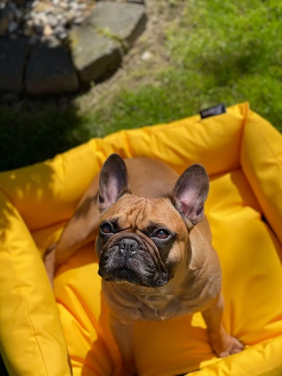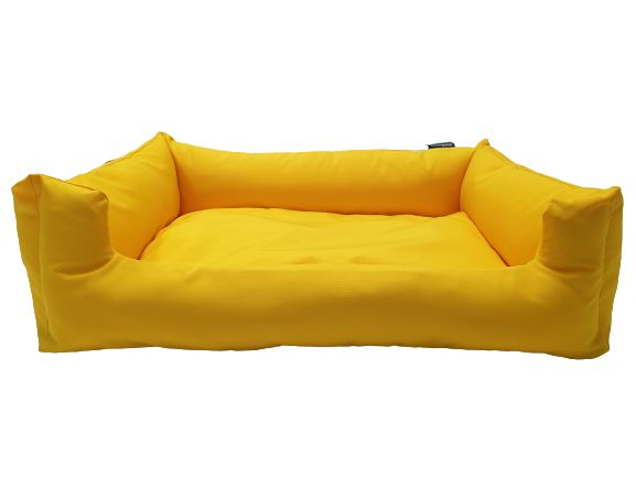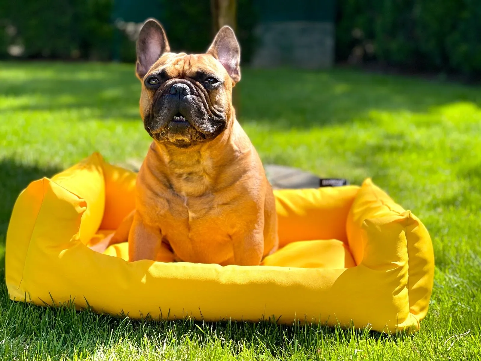 Żółte legowisko ręcznie szyte otwarte dla psa – słoneczny akcent i luksusowy wypoczynek