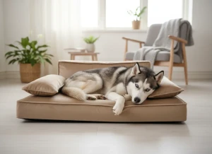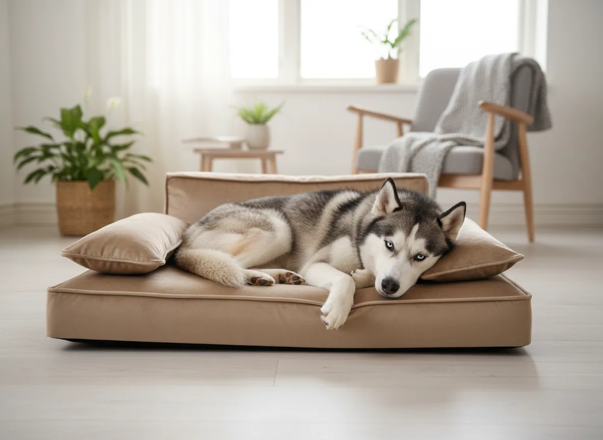 Beżowa kanapa ortopedyczna dla psa WERSAL – harmonia, styl i zdrowy sen w Twoim domu