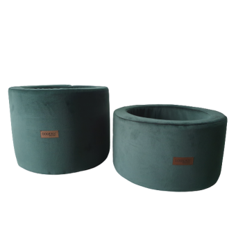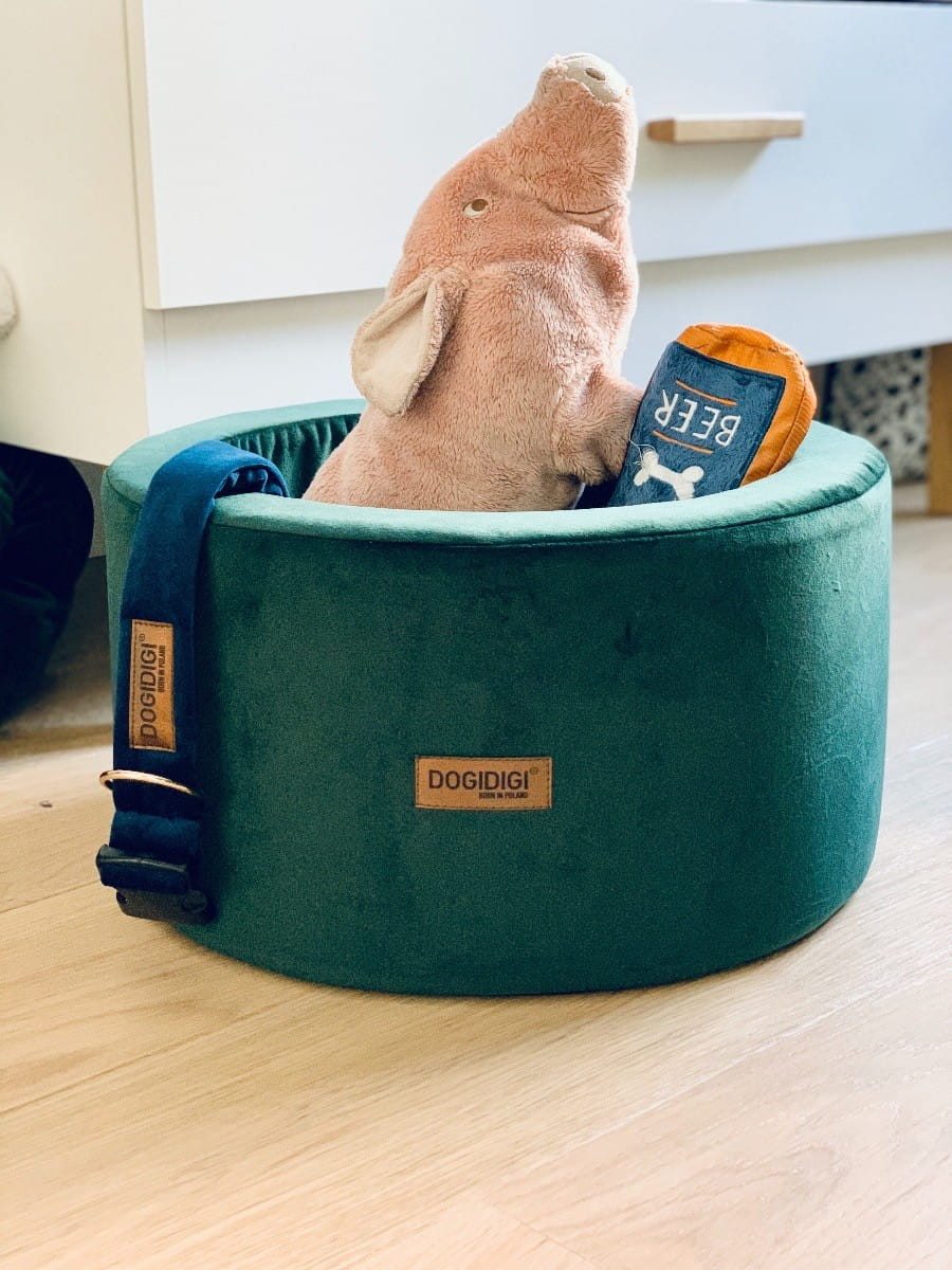 Welurowy pojemnik na zabawki dla psa Butelkowa Zieleń – Estetyczne przechowywanie w Twoim salonie