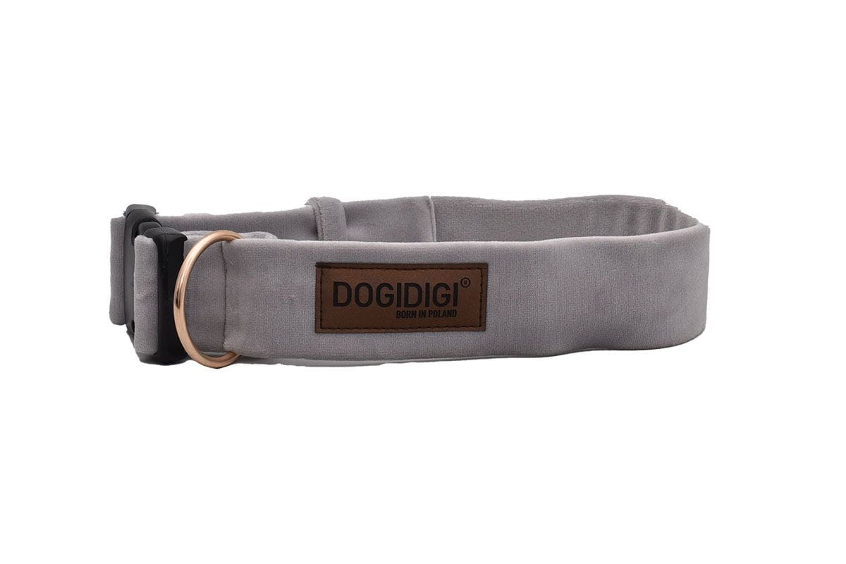 Designerska ręcznie szyta Szara szeroka obroża welurowa dla psa 4 cm – uniwersalna elegancja dla psów różnych ras