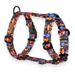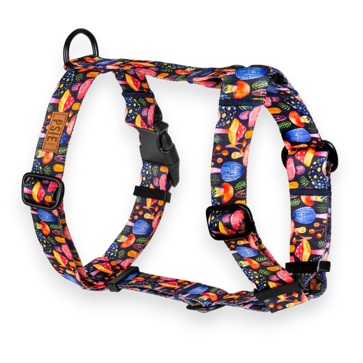 Szelki guard dla psa w czarnym kolorze z bajkowym wzorem kolorowych grzybków. Zakładane przez głowę z pojedynczą klamrą z tyłu – proste w użyciu i skuteczne w zabezpieczaniu przed ucieczką. Uniwersalna czerń z playfulnym wzorem to połączenie elegancji i dziecięcej radości.