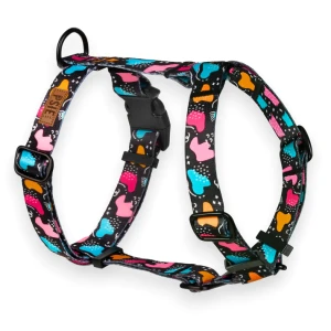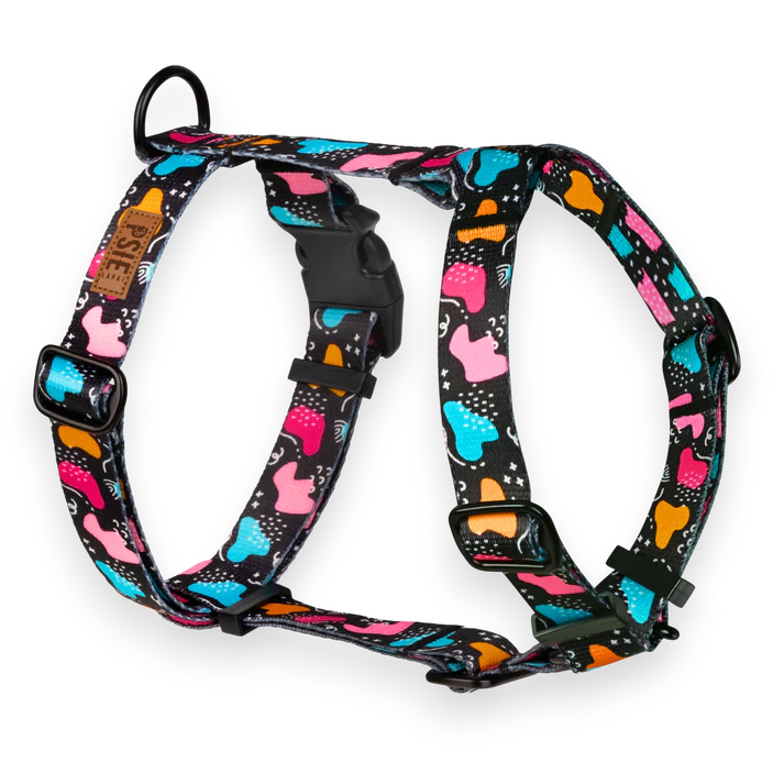 Szelki guard dla psa w klasycznej czarnej podstawie z artystycznymi kolorowymi kleksami. Zakładane przez głowę z jedną klamrą z tyłu – praktyczne i bezpieczne rozwiązanie zapobiegające ucieczkom. Łączą uniwersalność czarnego koloru z oryginalnym, energetycznym wzorem.