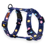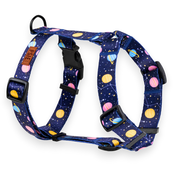 Szelki guard dla psa w głębokim, granatowym odcieniu z kosmicznym wzorem planet. Zakładane przez głowę z pojedynczą klamrą z tyłu – wygodne w codziennym użyciu i niezawodne w zabezpieczaniu przed ucieczką. Nie ograniczają naturalnych ruchów Twojego czworonoga.