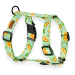 Szelki guard dla psa w świeżym zielonym kolorze z letnich wzorem melonów. Zakładane przez głowę z jedną klamrą z tyłu – praktyczne i bezpieczne rozwiązanie dla psów, które potrzebują szelek guard zapobiegających wyrywaniu się. Nie krępują naturalnych ruchów, idealnie sprawdzą się jako szelki guard dla psa który ciągnie na spacerze.