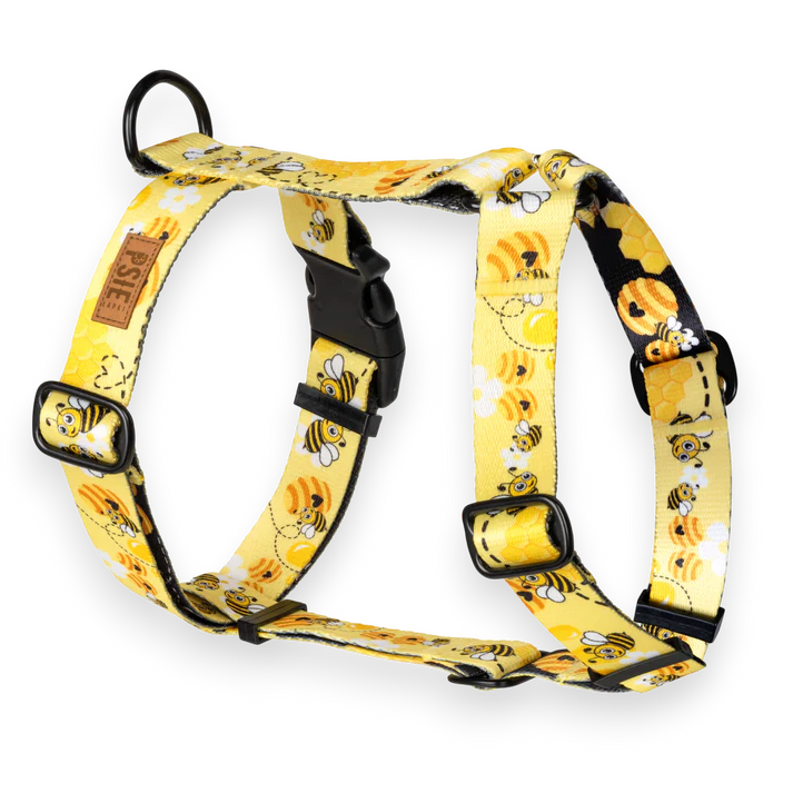 Szelki guard dla psa w słonecznym żółtym kolorze z motywem pracowityych pszczół. Zakładane przez głowę z pojedynczą klamrą umieszczoną z tyłu – prosty system, który sprawdza się w codziennym użytkowaniu. Skutecznie zabezpieczają przed ucieczką, jednocześnie dając pełną swobodę ruchów.