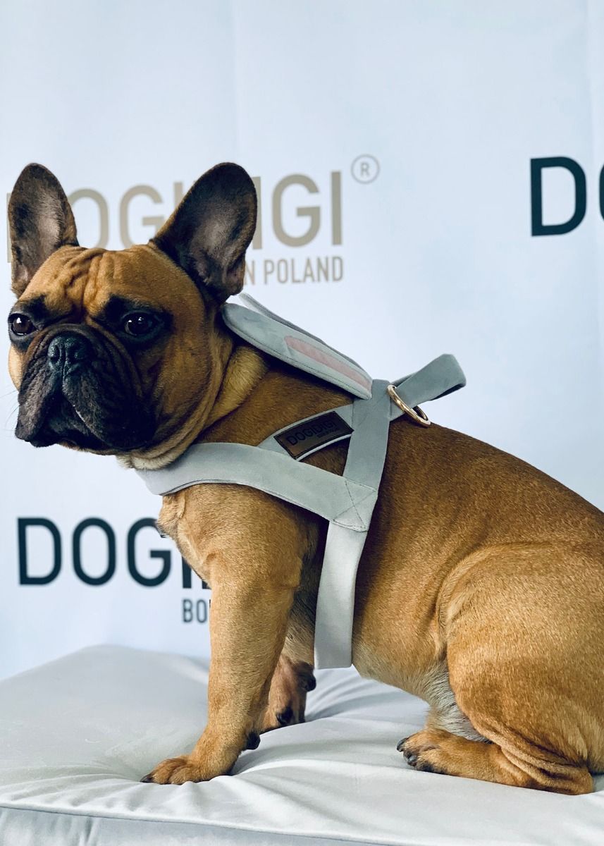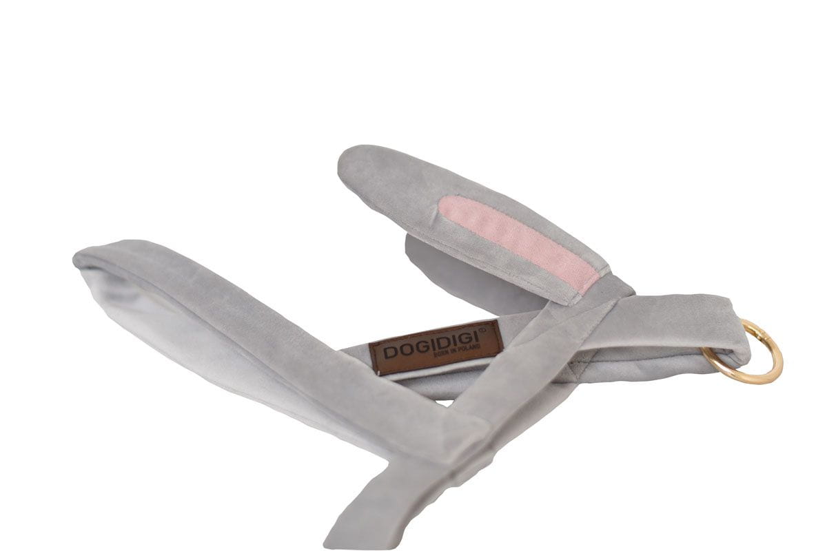Szelki Norweskie dla psa z uszkami królika – Szara Elegancja i Sportowy Duch